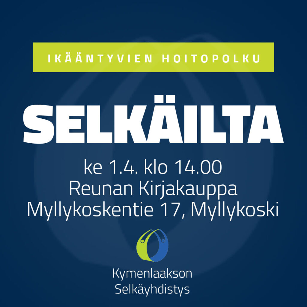 Huhtikuun Selkäilta järjestään keskiviikkona 1.4. kello 14 (Huom! Poikkeuksellinen aika) Kirjakauppa Reunan tiloissa (Myllykoskentie 17, Myllykoski). Tilaisuudessa Kymen Hyvinvointialueen edustaja kertoo ikääntyvien hoitopolusta. Tervetuloa!